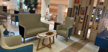 Les espaces communs, tels que la bibliothèque et le salon de coiffure contribuent à créer une ambiance sereine et sociale.
